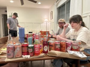 I will say that this was done twice – once in Feb. with just 3 of us and then again with all 5 of us in March. The beverages were not refridgerated the first time and the ice watered them down, impacting the overall flavor and fizziness. Additionally, there were too many!! By the end, we were all sick of the sweet flavor. Originally we judged based on the color, the scent, carbonation, and overall flavor. Thant said, it was fun.